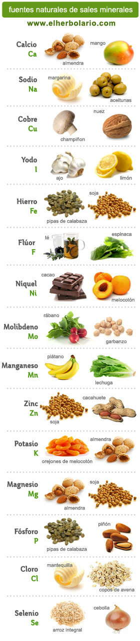 • Encontraremos gran cantidad de sales minerales en los vegetales, mucha más variedad y cantidad que en la carne, por eso una dieta rica en fruta y verdura fresca nos asegurará un organismo con menos predisposición a la enfermedad. Las algas, como la espirulina, los cereales, frutos secos, los cítricos y la soja en particular, son fuentes muy ricas de sales minerales.